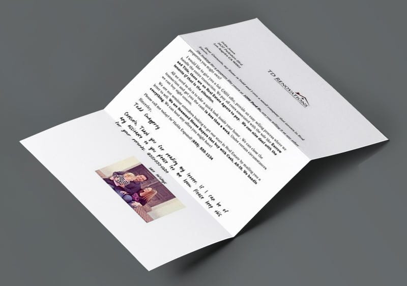 Build trust on the quick with a simple logo and a family picture that makes your mail piece memorable, builds trust.. Tell the sellers who you are, why you can help. Often sellers want to deal with a Mom & Pop Company with professionalism.