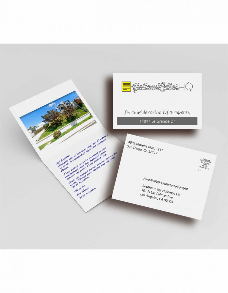 The job of your envelope is be inquisitive enough to get opened. Who else sends a letter like this with a yellow paper/ white paper with a handwritten message? And for once that is a good thing. Your mail piece does not get lost in the stack of mail . There is a large seller population that will only responds to letters. Most of the time you are going on Seller Appointments, that only call on letters, decreasing the competition.